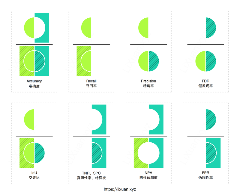 二分类模型常用评价指标一、定义 1.1 样本与结果的分类 如下图所示,以阴阳(Negative青,Positive黄)标记样本实际类别(如:阴阳、正负、男女、是否、有无……),以真假(True,False斜线阴影)描述预测结果是否正确,因此可将样本分为4类,简记为: 真阳(TP):样本为阳,预测为阳(黄绿色); 假阴(FN):样本为阳,预测为阴(黄绿色+斜线); 真阴(TN):样本为阴,预测为阴(青绿色); 假阳(FP):样本为阴,预测为阳(青绿色+斜线)。 2020-11-29机器学习